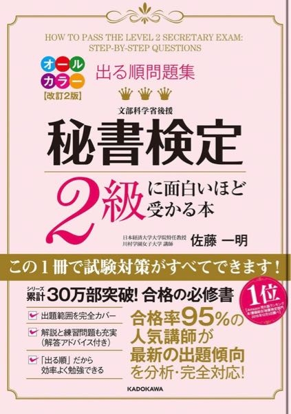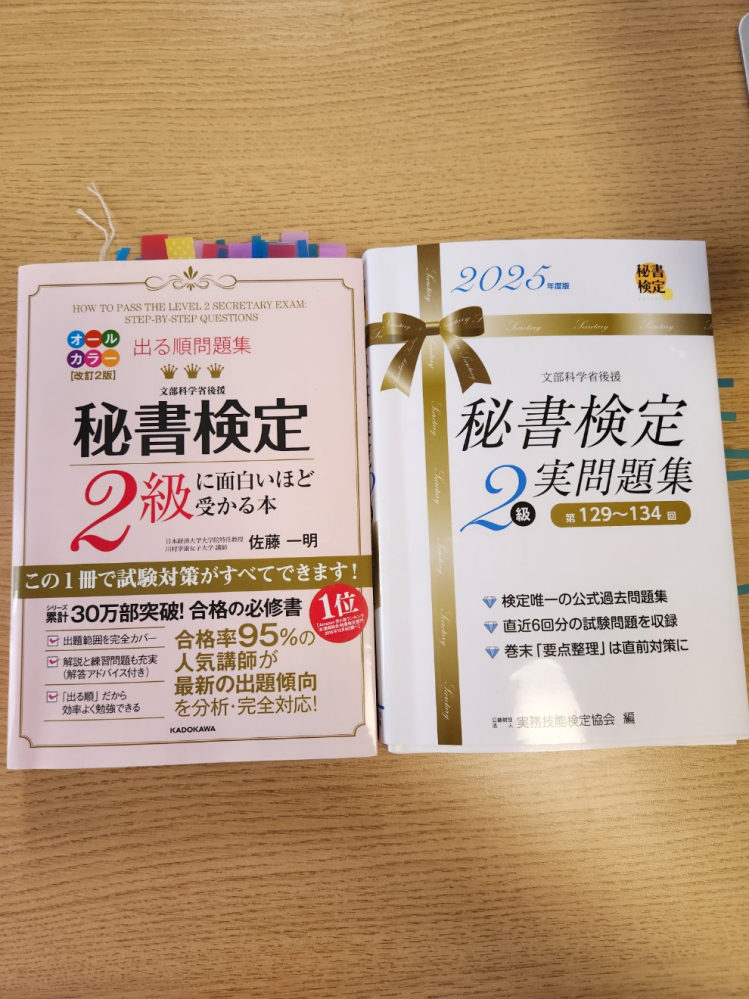 こんにちは! ちょうど昨日、秘書検定2級を合格した者です。(会社で取得するようにと言われました) 私はテキストは、質問者様が提示されている物と同じ、「出る順問題集秘書検定2級に面白いほど受かる本」と、「秘書検定2級実問題集2025年度版」の2冊を使って合格しました。 勉強の仕方はこの動画の方を参考にしました! ピンクのテキストと実問題集を2周し、私は3週間で合格しましたが、効率よくすれば2週間でも充分合格可能だと思います! ↓ https://youtu.be/skQUNIS7NWE?si=gnGLYDBCqEeYLMCP
