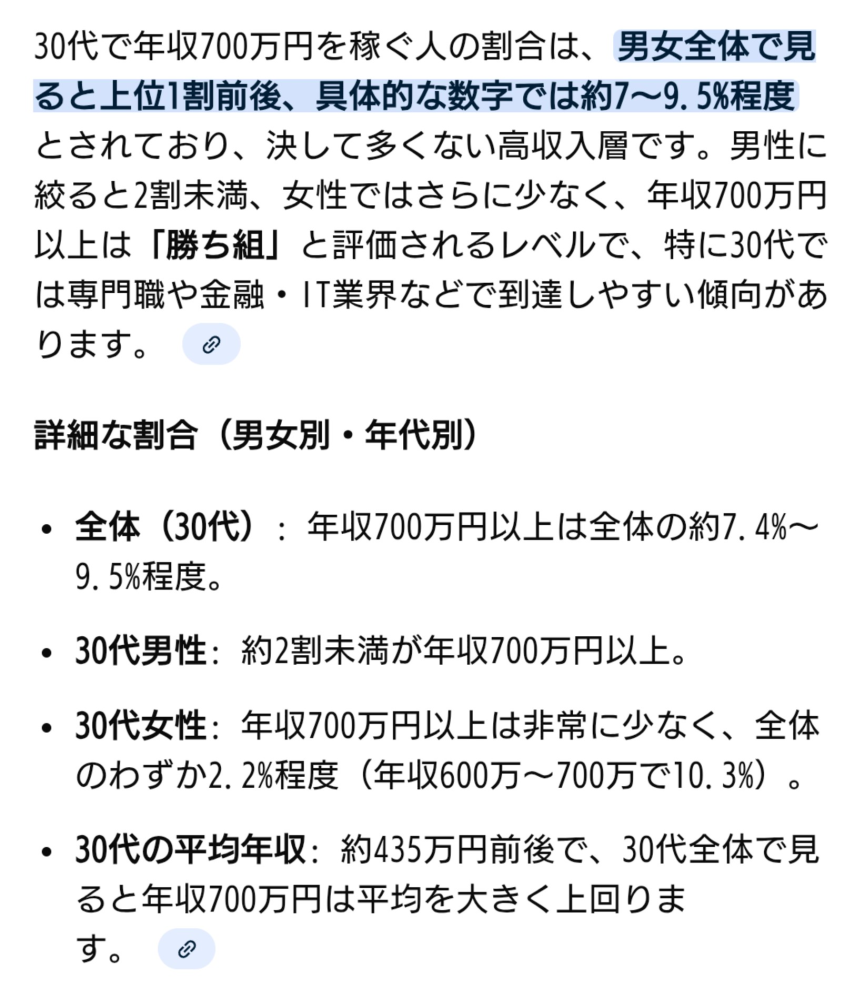 こういうのは自分を基準にしやすいのです。 専門職、大手企業、IT勤め等からみたら普通でも、それ以外からしたら普通ではないになります。 地方を含めた全体でみると平均より上になります。 30代で年収700万円を稼ぐ人の割合は、男女全体で見ると上位1割前後。 具体的な数字では約7~9.5%程度とされており、決して多くない高収入層です。 男性に絞ると2割未満。 女性ではさらに少なく年収700万円以上は「勝ち組」と評価されるレベルです。 特に30代では専門職や金融・IT業界などで到達しやすい傾向があります。 詳細な割合(男女別・年代別) 全体(30代): 年収700万円以上は全体の約7.4%〜9.5%程度。 30代男性: 約2割未満が年収700万円以上。 30代女性: 年収700万円以上は非常に少なく、全体のわずか2.2%程度(年収600万〜700万で10.3%)。 30代の平均年収: 約435万円前後で、30代全体で見ると年収700万円は平均を大きく上回ります。